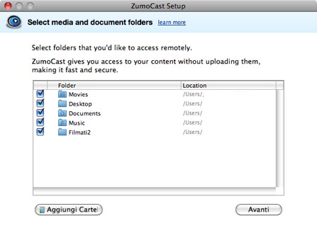 ZumoCast è una applicazione per iPhone, iPod touch e iPad che permette lo streaming in wifi e 3G di video e musica e la visione di altri file presenti sul proprio Mac o PC. Richiede l’installazione di una applicazione sul computer e la creazione di un account. Il desktop software è piuttosto pesante a dire il vero, arriva accompagnato da un Uninstaller e richiede un processore Intel e il sistema operativo Leopard o superiore. Il suo menulet si colloca nella barra dei menu e da lì si ha accesso alle preferenze e al sito di ZumoCast (il contenuto che abbiamo scelto nelle preferenze può essere visto in streaming anche tramite il browser).
