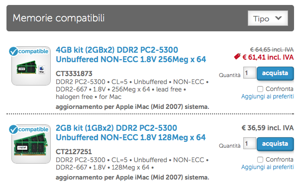 La Crucial, uno dei più importanti venditori di RAM (azienda meno cara della Apple) in questo momento offre il 5% di sconto sugli acquisti di memoria per Mac. Per sapere quali loro prodotti sono compatibili con il nostro computer si può utilizzare l’Advisor, che chiede dapprima il nome del fabbricante di computer (Apple nel nostro caso), poi la serie cui appartiene e infine il modello esatto. Un’altra possibilità consiste nello scaricare dalla stessa pagina uno strumento per scansionare il sistema. Questa applicazione esaminerà il Mac che state usando e vi darà un responso.