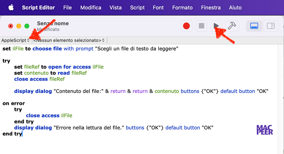 Leggere un file di testo e mostrarne il contenuto. Script Editor – Lezione 5