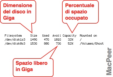 Nella figura compaiono due righe di dati perché sono due gli HD interni (il comando [b]df[/b] sta per "disk free").